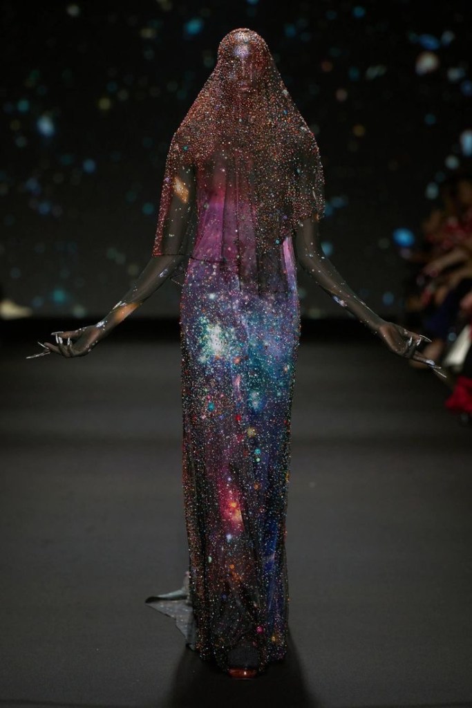 The skin was concretized by a multi-layered cocoon gown, made with six shades of skin tones plisse, a face molded velour hat and spiral cut boots made of printed leather. The flesh was a blood-red slender sheath covered in 68500 bugle beads that were sewn standing up as spikes. The dress was apparently so heavy (40 kilos) that it couldn’t be hung. A translucent sculptural harness with a helmet mask, worn with a wool-silk blend tailored jumpsuit, surmounted by a half-skeleton mannequin that dangled ominously at every step. The bones were “a reflection on the desire for immortality and the inevitable mortality”. And finally, a trailing veiled gown recalling the vision of a myriad of constellations closed the show. Embroidered with 97000 Swarovski crystals and a total of 1430 hours of hand work, the closing look was a recreation of the Milky Way. After stripping away the physical dimension of the body and tasting the paradoxical wonder of the fleetingness of the tangible dimension, Wun leads us toward the magic of spiritual abstraction, teaching one last lesson.