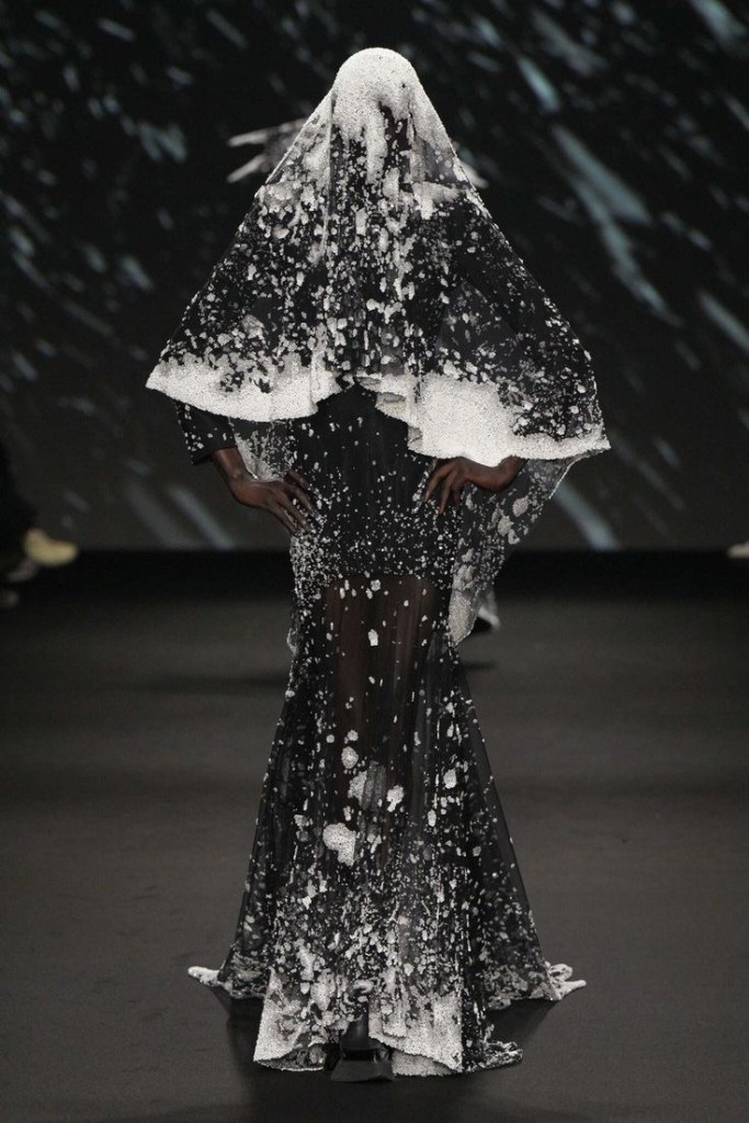Opening the show with winter, a period that makes people more reflective, according to the creator of the collection. A black gown with a matching veil embroidered in crystals, portraying the first falling of snow, moved elegantly through the shadows of the venue. A snowy effect was also rendered as a white layer on a slender trailing coat that looked as if it had been shredded apart and then mended back together with a kintsugi-like technique. This expression, kintsugi, refers to the Japanese art of putting broken pottery pieces back together with gold, a metaphor that serves as an invite to embrace the broken pieces of ourselves as an indispensable part of the human experience. And clearly, repaired cracks of the pottery represent the healing process that gives value to the end result rather than detracting from it.