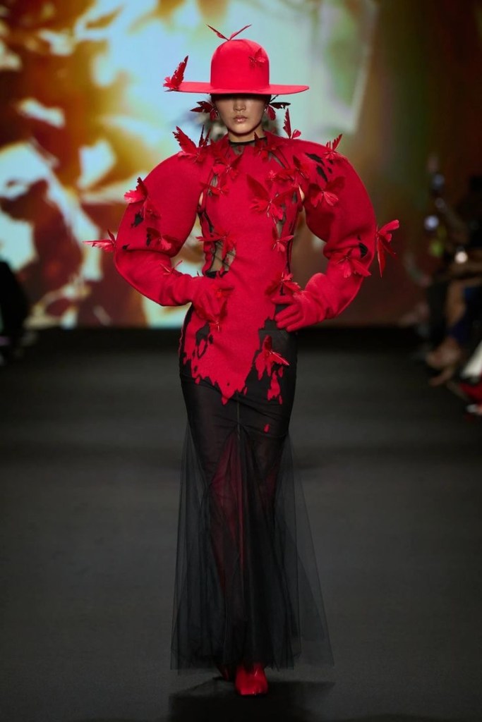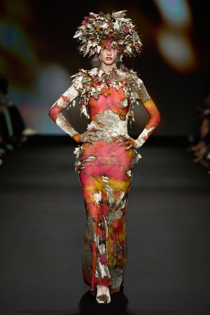 Black draperies and cloaks dotted with snowflakes, flamboyant silhouettes alternating with essential fabrics awash in cherry blossom flowers. Pastel-colored coats sprinkled with butterflies and vivid leafy dresses. Silky layers of skin toned fabric, a blood-red sheath covered in standing bugle beads. Skeleton mannequins and layers of cosmic tulle embroidered with galaxies of tiny multi-colored crystals, shimmering in the dim light. If you were asked to describe the essence of life and time you would notice that there is little to think about beyond the intriguing show displayed on the runway.