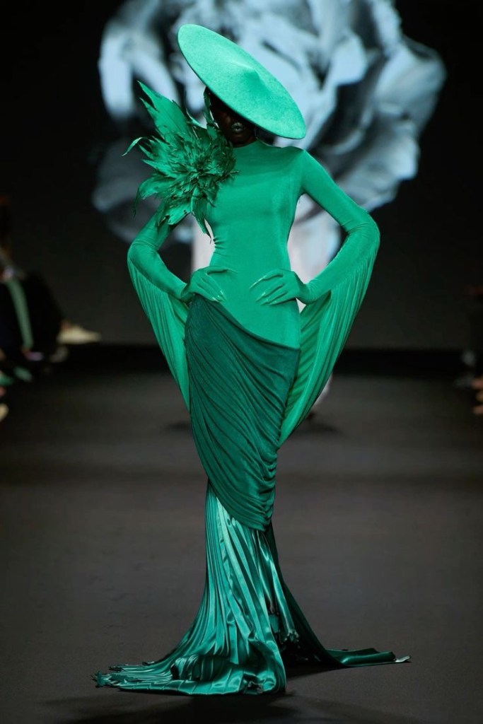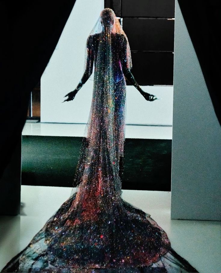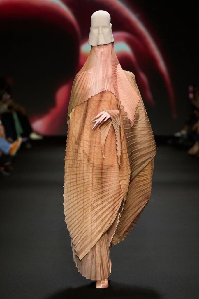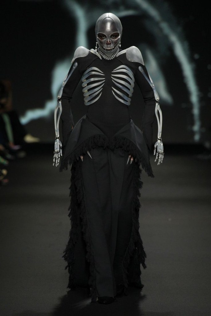 La pelle viene concretizzata da un abito a bozzolo multistrato, realizzato con sei tonalità di plissé color carne, un cappello di velluto modellato sul viso e stivali con taglio a spirale in pelle stampata. La carne si mostra come una sottile guaina rosso sangue ricoperta da 68500 perle cucite in posizione verticale. Il vestito era apparentemente così pesante (40 chili) da non poter essere nemmeno appeso. Una forma scultorea traslucida con una maschera a casco, indossata con una tuta sartoriale in misto lana e seta, resta sormontata da un manichino scheletrico in impetuoso movimento ad ogni passo. Le ossa rappresentano “una riflessione sul desiderio di immortalità e sull’inevitabile mortalità“. Per concludere, un abito velato e strascicato in grado di richiamare la visione di una miriade di costellazioni ha chiuso la sfilata. Ricamato con 97.000 cristalli Swarovski per un totale di 1430 ore di lavoro manuale, il look di chiusura indiscutibilmente riporta all’intenzione progettuale di una ricreazione della Via Lattea. Dopo aver spogliato la dimensione fisica del corpo e aver assaporato la paradossale meraviglia dell’effimerità della dimensione tangibile, Wun ci conduce verso la magia dell’astrazione spirituale, impartendo un’ultima lezione.