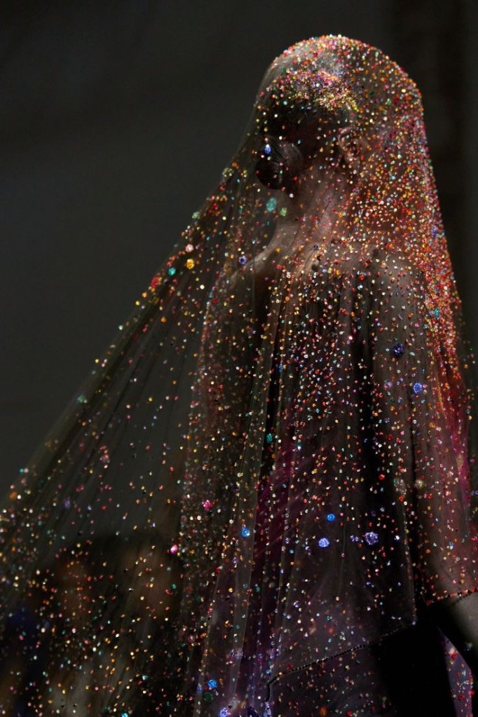 La sfilata si è aperta con l’inverno, un periodo che rende le persone più riflessive, secondo il creatore della collezione. Un abito nero con un velo abbinato ricamato in cristalli, raffigurante la prima neve che cade, si muove elegantemente tra le ombre della sala. L’effetto è stato ripreso anche attraverso la stesura di uno strato di candore su un sottile mantello che sembrava essere stato fatto a pezzi e poi ricucito, evocando la tecnica del kintsugi. Questa espressione, kintsugi, si riferisce all’arte giapponese di ricomporre i frammenti di ceramica rotti con l’oro, una metafora per invitare ad abbracciare i pezzi rotti di noi stessi come parte indispensabile dell’esperienza umana. E chiaramente, le crepe riparate della ceramica rappresentano il processo di guarigione che conferisce valore al risultato finale, anziché sminuirlo.