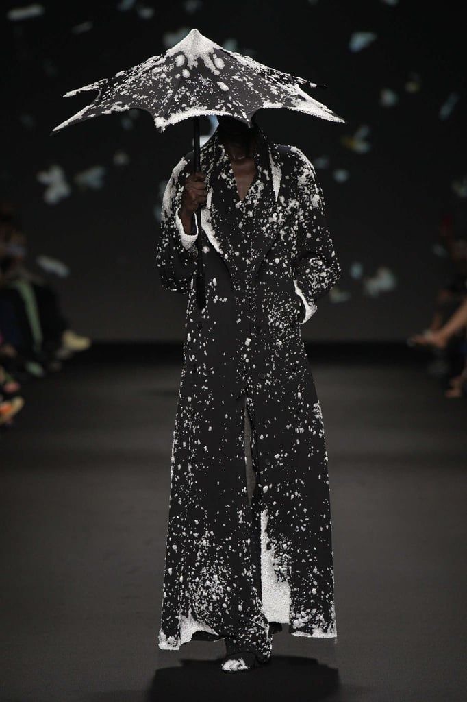 Drappeggi e mantelli neri punteggiati di fiocchi di neve, silhouette sgargianti alternate a tessuti essenziali inondati di fiori di ciliegio. Cappotti color pastello cosparsi di farfalle e abiti dalle foglie vivaci. Strati setosi di tessuto color pelle, una guaina rosso sangue ricoperta di perline. Manichini scheletrici e strati di tulle cosmico ricamati con galassie di minuscoli cristalli multicolore, scintillanti nella penombra. Se vi chiedessero di descrivere l’essenza della vita e del tempo, vi accorgereste che c’è poco a cui pensare al di là dell’intrigante spettacolo proposto sotto i riflettori da Robert Wun.